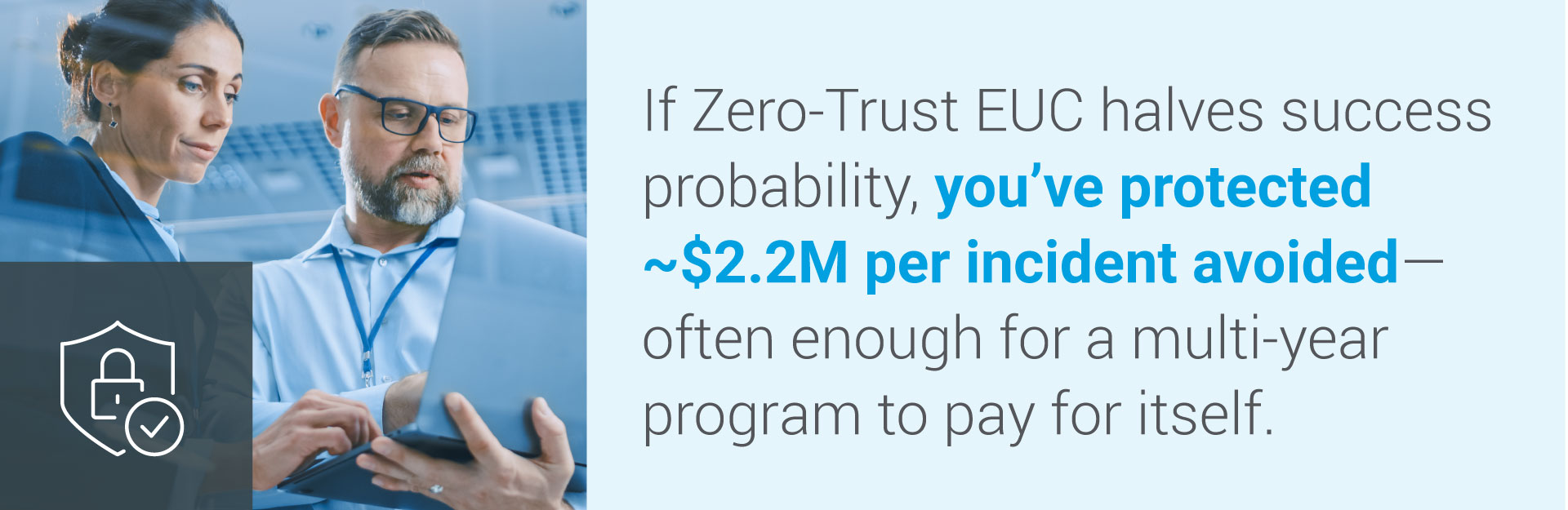Start with expected value: average security breach cost × probability of success. IBM's 2025 report pegs the global average at $4.4M. If Zero-Trust EUC halves success probability, you've protected ~$2.2M per incident avoided—often enough for a multi-year program to pay for itself. Add AI-assisted SecOps to identify and contain faster, and you compound savings (IBM).